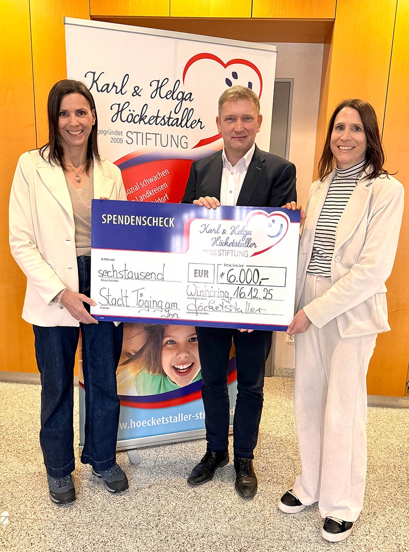 Übergabe des symbolischen Spendenschecks in Höhe von 6.000,- Euro an Bürgermeister Tobias Windhorst, Töging a. Inn am 16.12.2025.